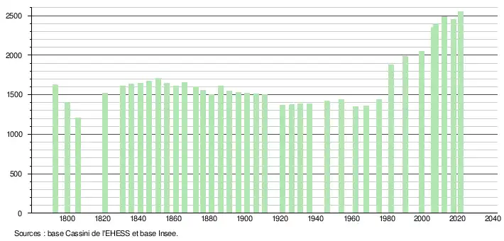 L'évolution du nombre d'habitants est connue à travers les recensements de la population effectués dans la commune depuis 1793. Pour les communes de moins de 10 000 habitants, une enquête de recensement portant sur toute la population est réalisée tous les cinq ans, les populations légales des années intermédiaires étant quant à elles estimées par interpolation ou extrapolation[24]. Pour la commune, le premier recensement exhaustif entrant dans le cadre du nouveau dispositif a été réalisé en 2007[25].