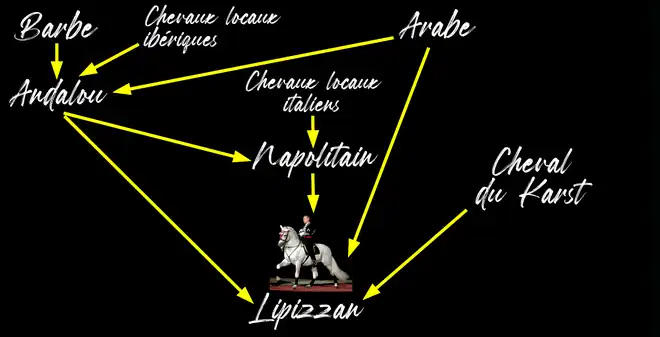 L'histoire du Lipizzan amène à évoquer d'autres races de chevaux célèbres en Europe, notamment le Barbe, l'Andalou, le Napolitain et l'Arabe[31], qui ont été croisés entre elles au Haras de Lipica après sa création, afin de développer une nouvelle race de chevaux pour la Cour d'Autriche[32],[S 17]. Au contraire du Pur-sang, qui est élevé sans croisement sur plusieurs siècles, le Lipizzan se révèle être un « melting-pot d'anciennes races de chevaux totalement ou partiellement évincées »[S 18].
