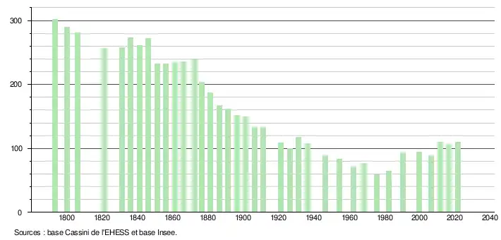L'évolution du nombre d'habitants est connue à travers les recensements de la population effectués dans la commune depuis 1793. Pour les communes de moins de 10 000 habitants, une enquête de recensement portant sur toute la population est réalisée tous les cinq ans, les populations légales des années intermédiaires étant quant à elles estimées par interpolation ou extrapolation[19]. Pour la commune, le premier recensement exhaustif entrant dans le cadre du nouveau dispositif a été réalisé en 2006[20].