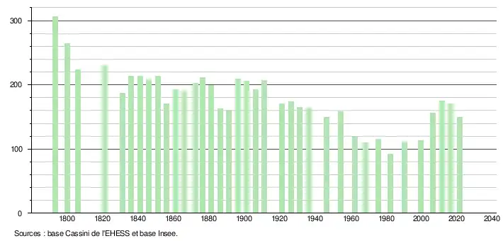 L'évolution du nombre d'habitants est connue à travers les recensements de la population effectués dans la commune depuis 1793. Pour les communes de moins de 10 000 habitants, une enquête de recensement portant sur toute la population est réalisée tous les cinq ans, les populations légales des années intermédiaires étant quant à elles estimées par interpolation ou extrapolation[22]. Pour la commune, le premier recensement exhaustif entrant dans le cadre du nouveau dispositif a été réalisé en 2006[23].