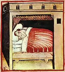 Au Moyen Âge, il est le meuble le plus important dans la demeure des pauvres (seul meuble confortable de la maison, il est l'endroit où l’on naît, on dort et on meurt) comme des plus fortunés chez qui, il est le symbole de prestige et de pouvoir (il est l'endroit où on reçoit, on travaille, on juge comme le lit de justice du roi). Dès le XIIIe siècle, dans les traités d'hygiène et de vie, les médecins écrivent leurs recommandations pour bien dormir : le prince comme le paysan dort nu mais avec un bonnet de nuit censé protéger le cerveau, organe de l'âme jugé sensible ; le ciel de lit apparaît au XIVe siècle avec un rôle fonctionnel (il protège de la poussière du plancher terré) et symbolique (il protège des rayons lunaires jugés maléfiques ou nocifs). Le dormeur récite une prière avant d'aller se coucher par peur de mourir pendant le sommeil, mort redoutée à l'époque car il n'a pas le temps de remettre son âme à Dieu et de recevoir l'extrême-onction ; le ciel ou demi-ciel de lit, comme le berceau, est orné de signes protecteurs (soleil, étoiles, saints). Le « lit idéal » doit avoir un dos de lit pour se protéger du froid, être accessible par un basset, être isolé par des courtines (tentures de lit) et surélevé par une planche épaisse ou estrade, garni d’un matelas moelleux, surmonté d’un ou plusieurs (selon la richesse) surmatelas appelés couettes – les médecins spécialisés en "litologie" recommandent la plume pour l’hiver, la laine ou le coton pour l’été – recouvertes de draps, couvertures et courtepointe, fourrures. Des banquettes, archebancs (coffres à couvercle plat utilisés comme banc) ou des sièges bas peuvent être disposés autour afin d'accueillir les personnes de compagnie[6].