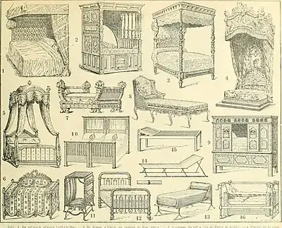 Si la forme des lits a suivi les modes et styles (Louis XV, Empire, Louis-Philippe, bateau)[10], l'emploi du sommier, qui n'était au départ qu'un simple treillis de branches entrelacées, tend à se généraliser. On en trouve à lattes, à ressorts, à treillis de toile. la nouveauté consiste surtout à employer de nouveaux matériaux : le fer et l'acier concurrencent le bois et le cuivre, et permet en outre la fabrication de ressorts hélicoïdaux ou à boudins qui augmentent le confort du couchage. Le coton prend une place prépondérante pour les draps et les enveloppes de couettes ou de matelas. Accessoirement, la fibre kapok remplit duvets et matelas bon marché.