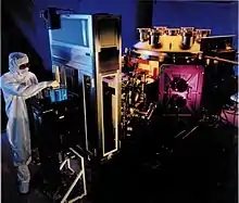 La lithographie extrême ultraviolet ou lithographie EUV est un procédé de photolithographie assez semblable aux procédés de lithographie classiques actuels[2]. Il utilise un rayonnement ultraviolet (UV) d'une longueur d'onde de l'ordre de dix à quinze nanomètres (le rayonnement EUV avoisine donc la gamme des rayons X-mous), en remplaçant les objectifs (ou masques dits « en transmission ») par une série de miroirs de précision (exemple des masques dits « en réflexion »). Il permet ainsi une résolution inférieure à 45 nm. C’est une technologie prometteuse pour le développement industriel des gravures inférieures à 10 nm.
