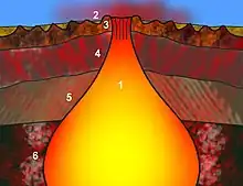 Section typique de la lithosphère océanique. 1. Chambre magmatique axiale 2. Sédiments 3. pillow lavas de basalte 4. Complexe filonien gabbroïque 5. Gabbros 6. Péridotites