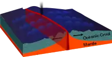 La croûte océanique est ainsi continuellement créée à la limite de ces plaques divergentes[alpha 1], en un processus continu, dans une structure qui prend généralement la forme d'une dorsale océanique.