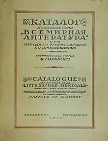 Couverture (bilingue français et russe) du premier catalogue des éditions de la Littérature mondiale (1919)