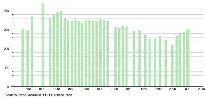 L'évolution du nombre d'habitants est connue à travers les recensements de la population effectués dans la commune depuis 1793. Pour les communes de moins de 10 000 habitants, une enquête de recensement portant sur toute la population est réalisée tous les cinq ans, les populations légales des années intermédiaires étant quant à elles estimées par interpolation ou extrapolation[20]. Pour la commune, le premier recensement exhaustif entrant dans le cadre du nouveau dispositif a été réalisé en 2005[21].