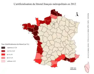 Les côtes du Nord, des Alpes-Maritimes et des Pyrénées-Atlantiques, étaient déjà artificialisées sur plus de 30 % de leur surface et les côtes départementales du Pas-de-Calais, de Seine-Maritime et de Loire-Atlantique l'étaient sur 20 % de leur superficie.
