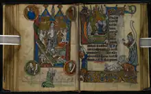 - f255v-256r : Les prières en français sont précédées d'une miniature retraçant la vie de Théophile d'Adana, qui aurait conclu un pacte avec le diable. L'initiale montre un homme en prière.