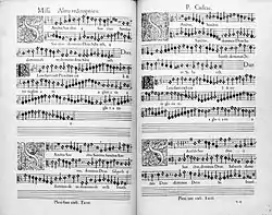 Lorsqu'il contient de la musique polyphonique, toutes les voix sont disposées côte à côte (superius et tenor à gauche, altus et bassus à droite, en général). Cette disposition génère une contrainte particulière quand une pièce est notée sur plusieurs pages : au moment de tourner la page, les voix doivent arriver en même temps en fin de page (ceci demande un soin particulier au copiste ou à l'imprimeur).
