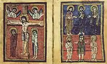 La première miniature présente sur la page verso la Crucifixion, flanquée en bas par Marie et Jean l'Évangéliste, et en haut par les personnifications du Soleil et de la Lune. La page recto en regard est partagée en deux registres. En haut, le Christ est en déisis, entre Jean le Baptiste et Marie, qui se tournent vers lui. En bas, un jeune laïc tête nue est représenté en position de prière entre les saints Pierre et Paul, reconnaissables par leurs attributs. Il porte un vêtement orné de galons d'or, et par-dessus un manteau court, une chlamyde dont la couleur pourpre indique sa royauté. Il n'y a pas d'autre insignes, comme par exemple une couronne. Dans le texte de légende de la crucifixion, la personne en prière prie le rex regis (Roi des rois, c'est-à-dire le Christ) pour l'illumination du cœur et du corps dans le sens de la suite de la Croix. La prière est :