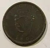 En 1801, le royaume d'Irlande est intégré au sein du Royaume-Uni de Grande-Bretagne et d'Irlande. Entre 1788 et 1806, la disette monétaire en matière de pièces divisionnaires donne lieu à la frappe de nombreux jetons en cuivre. La Soho Mint est chargée par Londres de fabriquer des pièces de ½ penny et de 1 penny figurant George III et la harpe celtique couronnée, surmontée de la mention Hibernia. Entre 1804 et 1813, la Bank of Ireland fait frapper des pièces de 10 shillings en argent, et contremarque des pièces de huit (8 réaux espagnols) pour une valeur de 6 shillings[9].