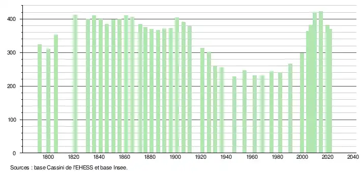 L'évolution du nombre d'habitants est connue à travers les recensements de la population effectués dans la commune depuis 1793. Pour les communes de moins de 10 000 habitants, une enquête de recensement portant sur toute la population est réalisée tous les cinq ans, les populations légales des années intermédiaires étant quant à elles estimées par interpolation ou extrapolation[40]. Pour la commune, le premier recensement exhaustif entrant dans le cadre du nouveau dispositif a été réalisé en 2004[41].