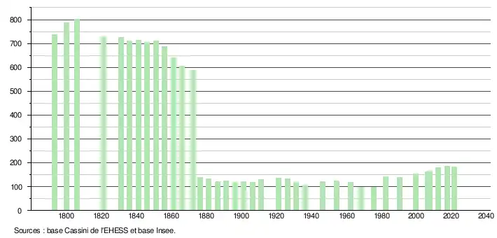 L'évolution du nombre d'habitants est connue à travers les recensements de la population effectués dans la commune depuis 1793. Pour les communes de moins de 10 000 habitants, une enquête de recensement portant sur toute la population est réalisée tous les cinq ans, les populations légales des années intermédiaires étant quant à elles estimées par interpolation ou extrapolation[40]. Pour la commune, le premier recensement exhaustif entrant dans le cadre du nouveau dispositif a été réalisé en 2007[41].