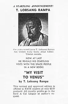 Tuesday Lobsang Rampa, pseudonyme de Cyril Henry Hoskin (Plympton, Angleterre, - Calgary, ) est un écrivain britannique qui prétendait être né au Tibet et être devenu le lama médecin à la lamaserie de Chakpori avant de parcourir le monde, puis d'abandonner volontairement son corps de naissance et avoir recours au procédé de transmigration[4] pour continuer sa vie dans celui d'un Anglais. Il avait pris le nom de Carl Kuon Suo jusqu'en 1962. Ses ouvrages, en particulier le premier, Le Troisième Œil, ont obtenu un important succès populaire et l'auteur est généralement perçu comme l'initiateur d'une « nouvelle littérature spirituelle », sinon du New Age dans son ensemble[5].
