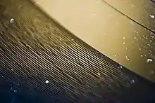Photographie rapprochée d'un disque microsillon, mettant en évidence les sillons qui stockent le son. Un sillon sans fin reboucle sur lui-même, permettant au son de se répéter indéfiniment.