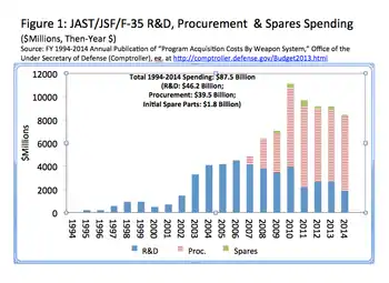 Le programme de développement, qui ne prévoyait pas de séries de prototypes, a accumulé un important retard (de 7 ans en 2014) par rapport au calendrier initial[11] et un dépassement de budget estimé à 74 % au mois de . En 2018, onze ans après le vol en 2007 du premier exemplaire de série, 300 appareils ont été livrés. Cependant aucun n'est vraiment opérationnel, les tests opérationnels des F-35 commencent en et ne devaient pas se finir avant fin 2019[12]. Sur les 500 avions livrés le , 354 sont des F-35A, 108 sont des F-35B avec une capacité de décollage court/atterrissage vertical (STOVL) et 38 sont des F-35C destinés à l'US Navy.