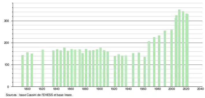 L'évolution du nombre d'habitants est connue à travers les recensements de la population effectués dans la commune depuis 1793. Pour les communes de moins de 10 000 habitants, une enquête de recensement portant sur toute la population est réalisée tous les cinq ans, les populations légales des années intermédiaires étant quant à elles estimées par interpolation ou extrapolation[17]. Pour la commune, le premier recensement exhaustif entrant dans le cadre du nouveau dispositif a été réalisé en 2005[18].