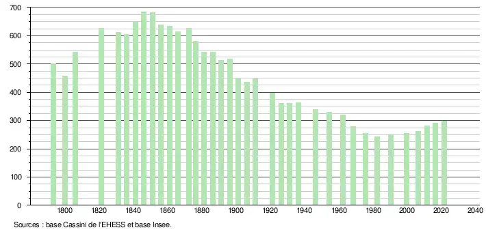 L'évolution du nombre d'habitants est connue à travers les recensements de la population effectués dans la commune depuis 1793. Pour les communes de moins de 10 000 habitants, une enquête de recensement portant sur toute la population est réalisée tous les cinq ans, les populations légales des années intermédiaires étant quant à elles estimées par interpolation ou extrapolation[33]. Pour la commune, le premier recensement exhaustif entrant dans le cadre du nouveau dispositif a été réalisé en 2006[34].