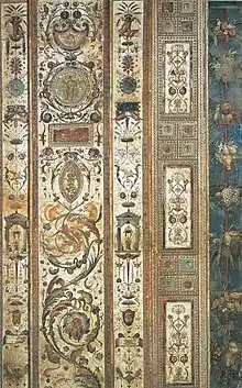 La façade du palais de Nicolas III sur le cortile di San Damaso a été aménagée par Bramante sous Jules II et poursuivie, du point de vue de la surintendance des travaux architecturaux, par Raphaël lui-même à l'époque de Léon X. Le pape Médicis, confirmant alors la faveur envers Raphaël et ses élèves, leur confie également le décor de stucs et de fresques qui doit s'inspirer de la Domus aurea, dont un extraordinaire essai de reconstitution archéologique avait déjà été présenté dans la Stufetta du cardinal Bibbiena (1516), au troisième étage de l'édifice[1].