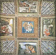 La deuxième voûte présente les Histoires d'Adam et Ève, de forme rectangulaire : Création d'Ève, Péché originel, Expulsion du paradis et Travail des ancêtres (très abîmée). La tendance dominante est de les référer à Penni assisté de Giulio Romano[5]. Dans ce cas également, les références à Michel-Ange sont évidentes, tandis que la scène de l'Expulsion apparaît assez fidèlement inspirée par la scène analogue d'Adam et Ève chassés de l'Éden (Masaccio) dans la chapelle Brancacci.