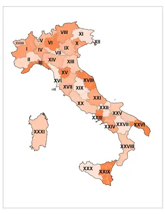 Les sénateurs sont élus pour un mandat de cinq ans[N 3] au scrutin uninominal majoritaire et au scrutin proportionnel d'Hondt dans 19 circonscriptions[N 4], 18 plurinominales — puis 19 après la scission des Abruzzes et Molise en — et la Vallée d'Aoste. En principe chaque circonscription est ensuite divisée en autant de collèges électoraux qu'elle ne compte de sièges à pourvoir mais — à l'exception de la création du collège de Trieste en — la répartition fixée en n'a jamais évolué malgré l'augmentation de la taille de la chambre haute.
