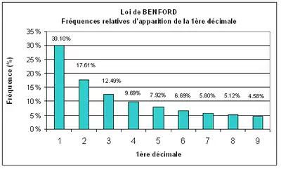 La loi de Benford, initialement appelée loi des nombres anormaux par Benford[1],[2], également connue sous le nom de loi de Newcomb-Benford[3], fait référence à une fréquence de distribution statistique observée empiriquement sur de nombreuses sources de données dans la vraie vie, ainsi qu'en mathématiques.