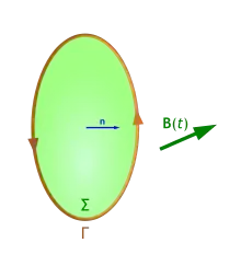 Les variations de flux de à travers la surface Σ créent un champ électrique induit dont la circulation le long du contour Γ est la f.é.m induite e. Le vecteur unitaire représente la normale à la surface Σ.