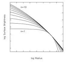où est la brillance de surface au centre. L'indice de Sérsic contrôle la pente de la courbe de brillance. À grands , la concentration de brillance est plus forte au centre et décroît progressivement, tandis qu'un petit indice de Sérsic dénote une plus faible brillance centrale et une décroissance brutale de la luminosité à grands rayons.