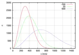 Distribution de la norme de la vitesse de molécules d'oxygène, à −100 °C, 20 °C et 600 °C