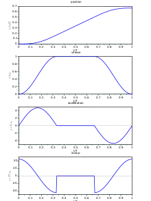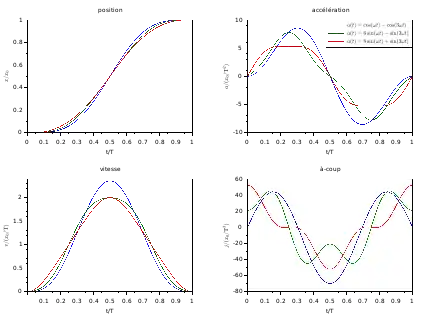 Le choix de la loi de mouvement est en général un compromis entre avoir une vitesse modérée, pour limiter les frottements et l'énergie dépensée, une accélération modérée, pour limiter les efforts des actionneurs et la puissance nécessaire, et un à-coup modéré, pour éviter les vibrations.