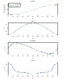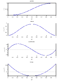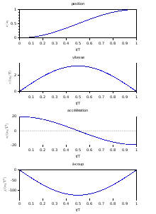 Les conditions initiales et finales imposent six conditions : x(0) = 0, v(0) = 0, a(0) = 0, x(T) = xf, v(T) = 0, a(T) = 0. La fonction x(T) est donc au minimum d'un polynôme de degré cinq :