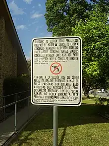 - Conformément à l'article 30.06, Code pénal (intrusion par le titulaire d'un permis avec une arme de poing dissimulée), une personne titulaire d'un permis en vertu du sous-chapitre H, chapitre 411, Code du gouvernement (loi sur les licences d'armes de poing), ne peut pas pénétrer dans cette propriété avec une arme de poing dissimulée[25].