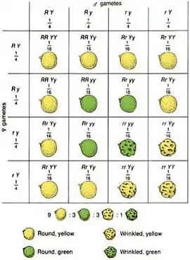 Exemple : Tous les individus dits de génération F1 issus du croisement entre un plant à graines rondes et un plant à graines ridées (tous deux homozygotes pour ce caractère) sont identiques, ils ne présentent que la version ronde de la forme. Le phénotype rond est dominant et le phénotype ridé est récessif.