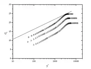 - d'une région de turbulence développée caractérisée par la loi logarithmique et dont le sommet est assez mal défini : , étant l'épaisseur de couche limite. Ce sommet définit une « échelle intégrale » de la couche limite ;