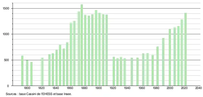 L'évolution du nombre d'habitants est connue à travers les recensements de la population effectués dans la commune depuis 1793. Pour les communes de moins de 10 000 habitants, une enquête de recensement portant sur toute la population est réalisée tous les cinq ans, les populations légales des années intermédiaires étant quant à elles estimées par interpolation ou extrapolation[24]. Pour la commune, le premier recensement exhaustif entrant dans le cadre du nouveau dispositif a été réalisé en 2006[25].