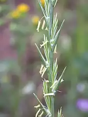 Les fleurs verdâtres sont regroupées en épis de 20 à 25 cm de long formés de nombreux épillets relativement écartés de l'axe de l'épi, chaque épillet comptant une dizaine de fleurs.