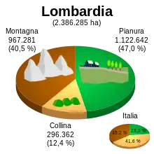 La surface de la Lombardie est divisée presque également entre les plaines (qui représentent environ 47 % du territoire) et les zones montagneuses (qui représentent 41 %). Les 12 % restants de la région sont vallonnés.