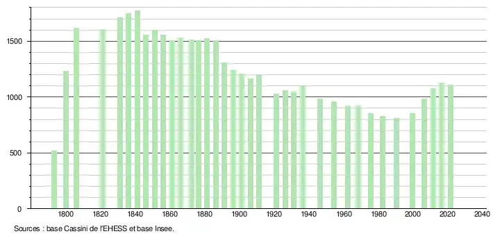 | L'évolution du nombre d'habitants est connue à travers les recensements de la population effectués dans la commune depuis 1793. Pour les communes de moins de 10 000 habitants, une enquête de recensement portant sur toute la population est réalisée tous les cinq ans, les populations légales des années intermédiaires étant quant à elles estimées par interpolation ou extrapolation[31]. Pour la commune, le premier recensement exhaustif entrant dans le cadre du nouveau dispositif a été réalisé en 2006[32]. En 2021, la commune comptait 1 106 habitants[Note 6], en diminution de 1,34 % par rapport à 2015 (Tarn : +1,82 %, France hors Mayotte : +1,84 %). |