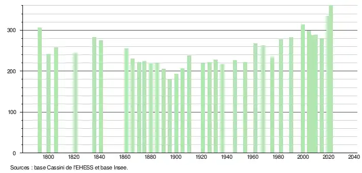 L'évolution du nombre d'habitants est connue à travers les recensements de la population effectués dans la commune depuis 1793. Pour les communes de moins de 10 000 habitants, une enquête de recensement portant sur toute la population est réalisée tous les cinq ans, les populations légales des années intermédiaires étant quant à elles estimées par interpolation ou extrapolation[22]. Pour la commune, le premier recensement exhaustif entrant dans le cadre du nouveau dispositif a été réalisé en 2004[23].