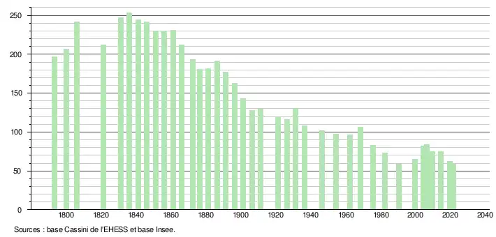 L'évolution du nombre d'habitants est connue à travers les recensements de la population effectués dans la commune depuis 1793. Pour les communes de moins de 10 000 habitants, une enquête de recensement portant sur toute la population est réalisée tous les cinq ans, les populations légales des années intermédiaires étant quant à elles estimées par interpolation ou extrapolation[14]. Pour la commune, le premier recensement exhaustif entrant dans le cadre du nouveau dispositif a été réalisé en 2004[15].