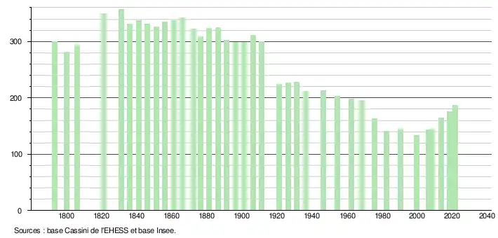 L'évolution du nombre d'habitants est connue à travers les recensements de la population effectués dans la commune depuis 1793. Pour les communes de moins de 10 000 habitants, une enquête de recensement portant sur toute la population est réalisée tous les cinq ans, les populations légales des années intermédiaires étant quant à elles estimées par interpolation ou extrapolation[18]. Pour la commune, le premier recensement exhaustif entrant dans le cadre du nouveau dispositif a été réalisé en 2008[19].