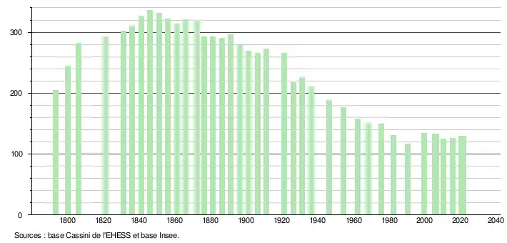 L'évolution du nombre d'habitants est connue à travers les recensements de la population effectués dans la commune depuis 1793. Pour les communes de moins de 10 000 habitants, une enquête de recensement portant sur toute la population est réalisée tous les cinq ans, les populations légales des années intermédiaires étant quant à elles estimées par interpolation ou extrapolation[16]. Pour la commune, le premier recensement exhaustif entrant dans le cadre du nouveau dispositif a été réalisé en 2005[17].