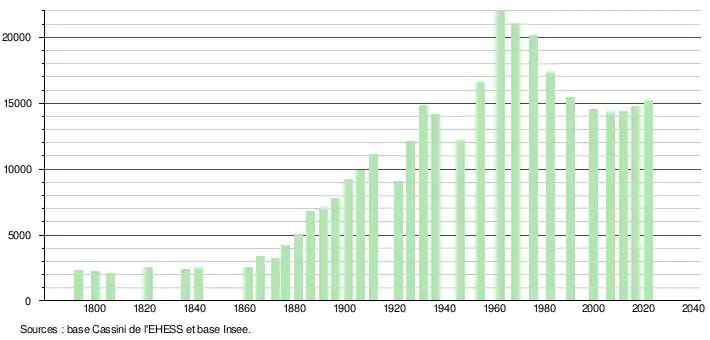 L'évolution du nombre d'habitants est connue à travers les recensements de la population effectués dans la commune depuis 1793. Pour les communes de plus de 10000habitants les recensements ont lieu chaque année à la suite d'une enquête par sondage auprès d'un échantillon d'adresses représentant 8% de leurs logements, contrairement aux autres communes qui ont un recensement réel tous les cinq ans[65],[Note 4].