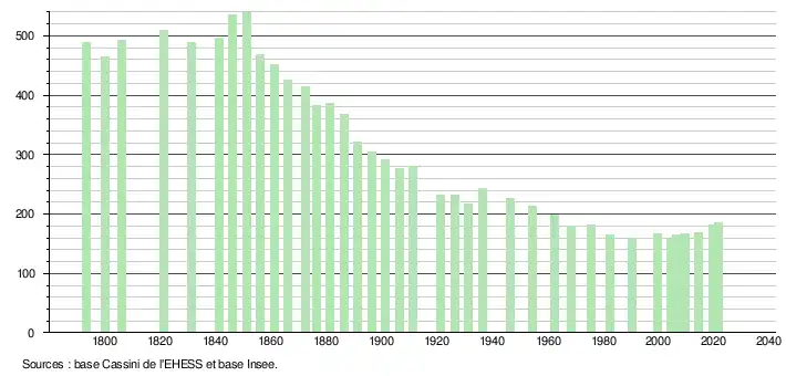 L'évolution du nombre d'habitants est connue à travers les recensements de la population effectués dans la commune depuis 1793. Pour les communes de moins de 10 000 habitants, une enquête de recensement portant sur toute la population est réalisée tous les cinq ans, les populations légales des années intermédiaires étant quant à elles estimées par interpolation ou extrapolation[28]. Pour la commune, le premier recensement exhaustif entrant dans le cadre du nouveau dispositif a été réalisé en 2004[29].