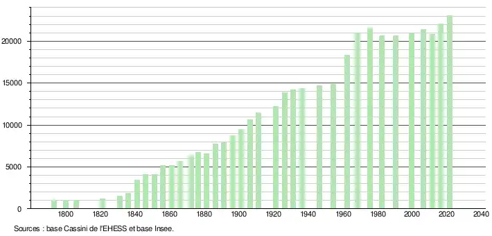 L'évolution du nombre d'habitants est connue à travers les recensements de la population effectués dans la commune depuis 1793. Pour les communes de plus de 10 000 habitants les recensements ont lieu chaque année à la suite d'une enquête par sondage auprès d'un échantillon d'adresses représentant 8 % de leurs logements, contrairement aux autres communes qui ont un recensement réel tous les cinq ans[29],[Note 3].