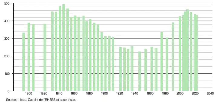 L'évolution du nombre d'habitants est connue à travers les recensements de la population effectués dans la commune depuis 1793. Pour les communes de moins de 10 000 habitants, une enquête de recensement portant sur toute la population est réalisée tous les cinq ans, les populations légales des années intermédiaires étant quant à elles estimées par interpolation ou extrapolation[15]. Pour la commune, le premier recensement exhaustif entrant dans le cadre du nouveau dispositif a été réalisé en 2004[16].