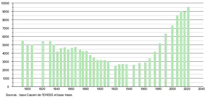 L'occupation des sols de la commune, telle qu'elle ressort de la base de données européenne d’occupation biophysique des sols Corine Land Cover (CLC), est marquée par l'importance des forêts et milieux semi-naturels (58,5 % en 2018), néanmoins en diminution par rapport à 1990 (63,6 %). La répartition détaillée en 2018 est la suivante : forêts (57,5 %), cultures permanentes (19,9 %), zones urbanisées (12,7 %), zones agricoles hétérogènes (7,2 %), terres arables (1,3 %), milieux à végétation arbustive et/ou herbacée (1 %), prairies (0,5 %)[24]. L'évolution de l’occupation des sols de la commune et de ses infrastructures peut être observée sur les différentes représentations cartographiques du territoire : la carte de Cassini (XVIIIe siècle), la carte d'état-major (1820-1866) et les cartes ou photos aériennes de l'IGN pour la période actuelle (1950 à aujourd'hui)[Carte 1].