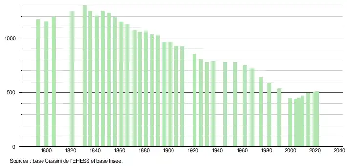 L'évolution du nombre d'habitants est connue à travers les recensements de la population effectués dans la commune depuis 1793. Pour les communes de moins de 10 000 habitants, une enquête de recensement portant sur toute la population est réalisée tous les cinq ans, les populations légales des années intermédiaires étant quant à elles estimées par interpolation ou extrapolation[19]. Pour la commune, le premier recensement exhaustif entrant dans le cadre du nouveau dispositif a été réalisé en 2004[20].