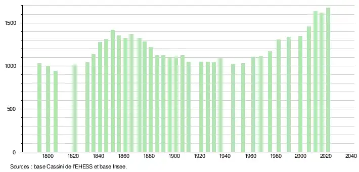 L'évolution du nombre d'habitants est connue à travers les recensements de la population effectués dans la commune depuis 1793. Pour les communes de moins de 10 000 habitants, une enquête de recensement portant sur toute la population est réalisée tous les cinq ans, les populations légales des années intermédiaires étant quant à elles estimées par interpolation ou extrapolation[18]. Pour la commune, le premier recensement exhaustif entrant dans le cadre du nouveau dispositif a été réalisé en 2006[19].